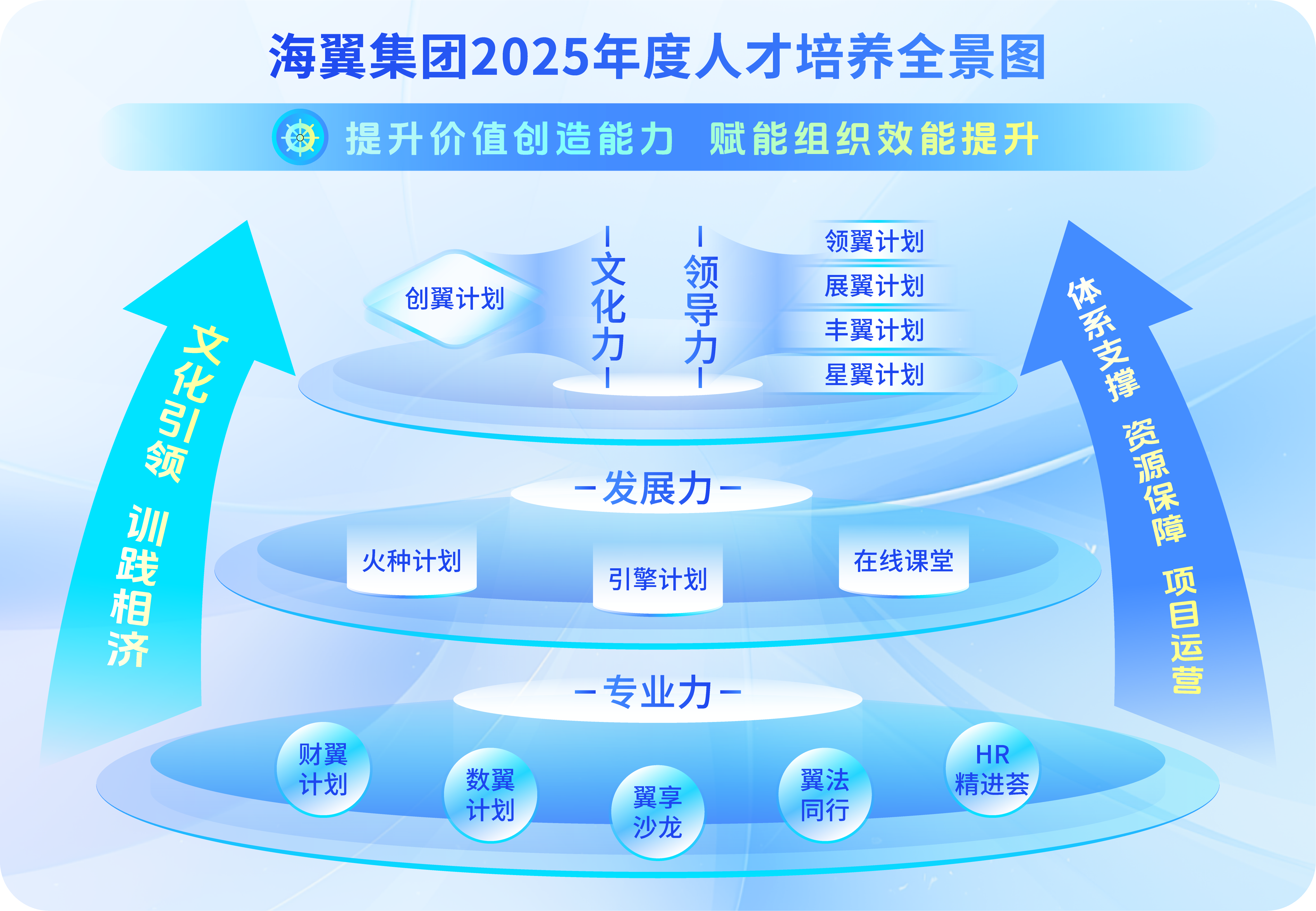 2025年海翼集團人才培養緊扣“強鏈拓圈,向新求質(zhì)”主題,以“提升價(jià)值創(chuàng )造能力,賦能組織效能提升”為使命,以“文化引領(lǐng)、訓踐相濟”理念為指導,以“體系支撐、資源保障、項目運營(yíng)”為支柱,厚植“文化力”、鍛造“領(lǐng)導力”、夯實(shí)“發(fā)展力”、提升“專(zhuān)業(yè)力”,構建“四力聚能”培訓體系,培育“文化認同、領(lǐng)導卓越、專(zhuān)業(yè)過(guò)硬”的優(yōu)秀人才隊伍。